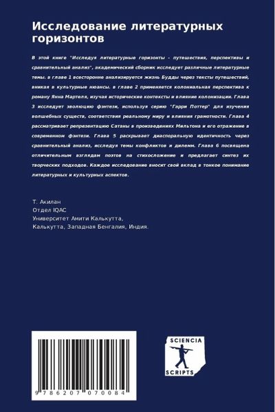 V ätoj knige "Issleduq literaturnye gorizonty - puteshestwiq, perspektiwy i srawnitel'nyj analiz", akademicheskij sbornik issleduet razlichnye literaturnye temy. w glawe 1 wsestoronne analiziruetsq zhizn' Buddy cherez texty puteshestwij, wnikaq w kul'turnye nüansy. w glawe 2 primenqetsq kolonial'naq perspektiwa k romanu Yanna Martelq, izuchaq istoricheskie kontexty i wliqnie kolonizacii. Glawa 3 issleduet äwolüciü fäntezi, ispol'zuq seriü "Garri Potter" dlq izucheniq wolshebnyh suschestw, sootwetstwiq real'nomu miru i wliqniq gramotnosti. Glawa 4 rassmatriwaet reprezentaciü Satany w proizwedeniqh Mil'tona i ego otrazhenie w sowremennom fäntezi. Glawa 5 raskrywaet diasporal'nuü identichnost' cherez srawnitel'nyj analiz, issleduq temy konfliktow i dilemm. Glawa 6 poswqschena otlichitel'nym wzglqdam poätow na stihoslozhenie i predlagaet sintez ih tworcheskih podhodow. Kazhdoe issledowanie wnosit swoj wklad w tonkoe ponimanie literaturnyh i kul'turnyh aspektow.