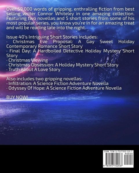Over 59,000 words of gripping, enthralling fiction from best-selling writer Connor Whiteley in one amazing collection. Featuring two novellas and 5 short stories from some of his most popular series, you know you're in for an amazing treat and will be reading late into the night. Issue 40's Intriguing Short Stories Includes: · Christmas Eve Proposal: A Gay Sweet Holiday Contemporary Romance Short Story · Final Day: A Hardboiled Detective Holiday Mystery Short Story · Christmas Viewing · Christmas Obsession: A Holiday Mystery Short Story · Truth About A Love Story Also includes two gripping novellas: · Infiltration: A Science Fiction Adventure Novella · Odyssey Of Hope: A Science Fiction Adventure Novella BUY NOW!