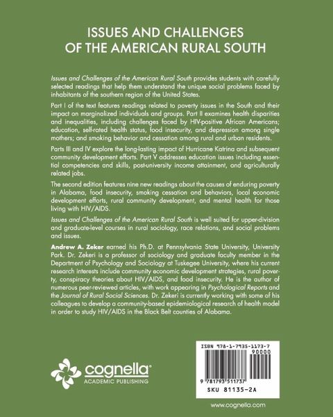 Issues and Challenges of the American Rural South provides students with carefully selected readings that help them understand the unique social problems faced by inhabitants of the southern region of the United States. Part I of the text features readings related to poverty issues in the South and their impact on marginalized individuals and groups. Part II examines health disparities and inequalities, including challenges faced by HIV-positive African Americans; education, self-rated health status, food insecurity, and depression among single mothers; and smoking behavior and cessation among rural and urban residents. Parts III and IV explore the long-lasting impact of Hurricane Katrina and subsequent community development efforts. Part V addresses education issues including essential competencies and skills, post-university income attainment, and agriculturally related jobs. The second edition features nine new readings about the causes of enduring poverty in Alabama, food insecurity, smoking cessation and behaviors, local economic development efforts, rural community development, and mental health for those living with HIV/AIDS. Issues and Challenges of the American Rural South is well suited for upper-division and graduate-level courses in rural sociology, race relations, and social problems and issues. Andrew A. Zekeri earned his Ph.D. at Pennsylvania State University, University Park. Dr. Zekeri is a professor of sociology and graduate faculty member in the Department of Psychology and Sociology at Tuskegee University, where his current research interests include community economic development strategies, rural poverty, conspiracy theories about HIV/AIDS among HIV-positive patients, and food insecurity. He is the author of numerous peer-reviewed articles, with work appearing in Psychological Reports and the Journal of Rural Social Sciences. Dr. Zekeri is currently working with some of his colleagues to develop a community-based epidemiological research of health model in order to study HIV/AIDS in the Black Belt counties of Alabama.