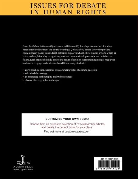Issues for Debate in Human Rights, drawn from recent reports from CQ Press s CQ Researcher, takes up these and other compelling questions. Each selection explores who the key players are and what s at stake, skillfully covering the range of opinion surrounding an issue and preparing students to engage in the debate. Features include a pro/con box, chronology, annotated bibliography, web resources, photos, charts, graphs, and maps.