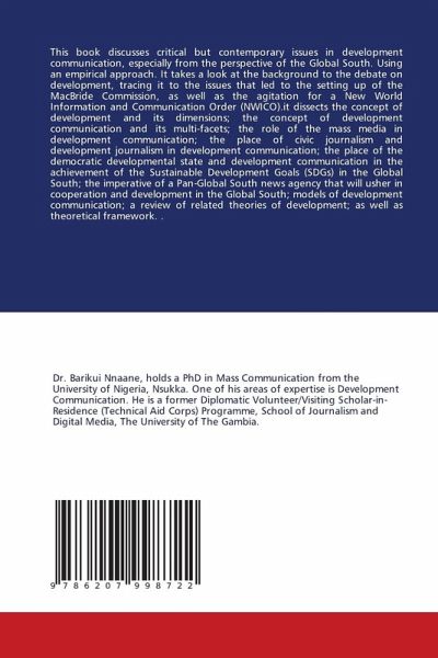 This book discusses critical but contemporary issues in development communication, especially from the perspective of the Global South. Using an empirical approach. It takes a look at the background to the debate on development, tracing it to the issues that led to the setting up of the MacBride Commission, as well as the agitation for a New World Information and Communication Order (NWICO).it dissects the concept of development and its dimensions; the concept of development communication and its multi-facets; the role of the mass media in development communication; the place of civic journalism and development journalism in development communication; the place of the democratic developmental state and development communication in the achievement of the Sustainable Development Goals (SDGs) in the Global South; the imperative of a Pan-Global South news agency that will usher in cooperation and development in the Global South; models of development communication; a review of related theories of development; as well as theoretical framework. .