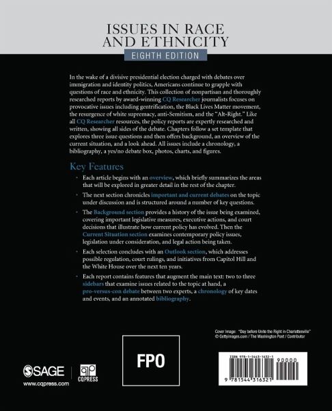 In the wake of a divisive presidential election charged with debates over immigration and identity politics, Americans continue to grapple with questions of race and ethnicity. This collection of nonpartisan and thoroughly researched reports focuses on provocative issues including gentrification, the Black Lives Matter movement, and the resurgence of white supremacy, anti-Semitism, and the "Alt-Right." Because it’s CQ Researcher, the policy reports are expertly researched and written, showing all sides of the debate. Chapters follow a set template, exploring three issue questions, then offering background, an overview of the current situation, and a look ahead. All issues include a chronology, bibliography, "yes/no" debate box, photos, charts, and figures.