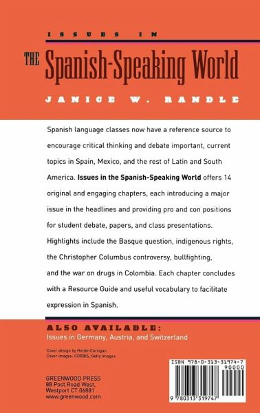 Spanish language classes now have a reference source to encourage critical thinking and debate important, current topics in Spain, Mexico, and the rest of Latin and South America. Issues in the Spanish-Speaking World offers 14 original and engaging chapters, each introducing a major issue in the headlines and providing pro and con positions for student debate, papers, and class presentations. Highlights include the Basque question, indigenous rights, the Christopher Columbus controversy, bullfighting, and the war on drugs in Colombia. Each chapter concludes with a Resource Guide and useful vocabulary to facilitate expression in Spanish.