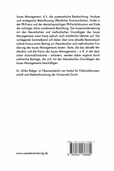 Issues Management, d.h. die systematische Beobachtung, Analyse und strategische Beeinflussung öffentlicher Kommunikation, findet in der PR-Praxis und der deutschsprachigen PR-Fachdiskussion seit Ende der achtziger Jahre zunehmend Beachtung. Die Auseinandersetzung mit den theoretischen und methodischen Grundlagen des Issues Managements weist heute jedoch noch erhebliche Defizite auf. Der vorliegende Sammelband will daher über eine aktuelle Bestandsaufnahme hinaus einen Beitrag zur theoretischen und methodischen Fundierung des Issues Managements leisten. Texte, die das aktuelle Verständnis und die Praxis des Issues Managements - z.B. in der deutschen Automobilindustrie - erläutern, werden daher ergänzt durch zahlreiche Beiträge, die sich mit den theoretischen Grundlagen des Issues Managements beschäftigen.