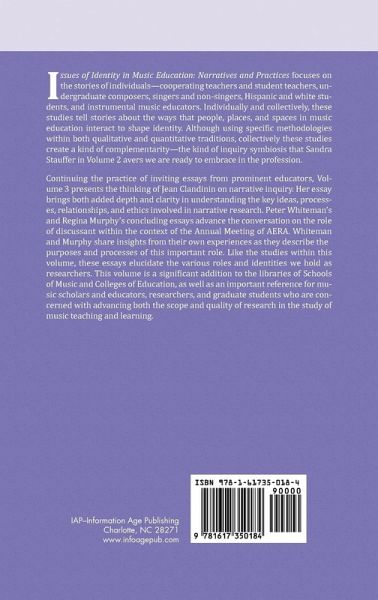 A volume in Advances in Music Education Research Series Editors Linda K. Thompson, Lee University and Mark Robin Campbell, SUNY at Potsdam Editorial Board: William Bauer, Case Western Reserve University. Susan Wharton Conkling, Eastman School of Music, University of Rochester. Colleen Conway, University of Michigan. Lisa R. Hunter, The State University of New York College at Buffalo. Joshua A. Russell, The Hartt School, University of Hartford. Peter Whiteman, Institute of Early Childhood, Macquarie University. Issues of Identity in Music Education: Narratives and Practices focuses on the stories of individuals-cooperating teachers and student teachers, undergraduate composers, singers and non-singers, Hispanic and white students, and instrumental music educators. Individually and collectively, these studies tell stories about the ways that people, places, and spaces in music education interact to shape identity. Although using specific methodologies within both qualitative and quantitative traditions, collectively these studies create a kind of complementarity-the kind of inquiry symbiosis that Sandra Stauffer in Volume 2 avers we are ready to embrace in the profession. Continuing the practice of inviting essays from prominent educators, Volume 3 presents the thinking of Jean Clandinin on narrative inquiry. Her essay brings both added depth and clarity in understanding the key ideas, processes, relationships, and ethics involved in narrative research. Peter Whiteman's and Regina Murphy's concluding essays advance the conversation on the role of discussant within the context of the Annual Meeting of AERA. Whiteman and Murphy share insights from their own experiences as they describe the purposes and processes of this important role. Like the studies within this volume, these essays elucidate the various roles and identities we hold as researchers. This volume is a significant addition to the libraries of Schools of Music and Colleges of Education, as well as an important reference for music scholars and educators, researchers, and graduate students who are concerned with advancing both the scope and quality of research in the study of music teaching and learning.