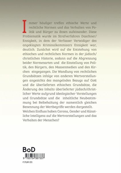 Immer häufiger treffen ethische Werte und rechtliche Normen und das Verhalten von Politik und Bürger zu ihnen aufeinander. Diese Problematik wurde im Strafverfahren Daschner/Ennigkeit, in dem der Verfasser Verteidiger des angeklagten Kriminalkommisars Ennigkeit war, deutlich. Zunächst wird auf die Entstehung von ethischen und rechtlichen Normen in der jüdisch/christlichen Historie, sodann auf die Abgrenzung beider Normenarten und die Einstellung von Politik, den Bürgern, den Massenmedien und den Kirchen eingegangen. Die Wandlung von rechtlichen Grundsätzen infolge von anderen Wertvorstellungen angesichts des mangelnden Bezugs auf Gott und die überlieferten ethischen Grundsätze, die Änderung des Inhalts überlieferter jüdisch/christlicher Werte aufgrund ideologischer Vorstellungen und Grundsätze und die inhaltliche Neubestimmung bei Beibehaltung der namentlich gleichen Benennung der Wertbegriffe werden dargestellt.Welchen Einfluss haben Corona, Gender und Künstliche Intelligenzauf die Wertvorstellungen und das Verhalten der Menschen?