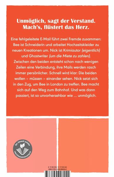 verheiratet, seine Frau Poll hat ihn aber mit Nicks bestem Freund Jez betrogen, die Ehe ist am Ende…mehrDurch Zufall landet eine i-Mail von Nicolas Belcher bei Rebecca - Bee - Davies, die prompt eine E-Mail zurückschreibt und Nick auf den Fehler hinweist. Zwischen den beiden beginnt eine Unterhaltung, die irgendwann dazu führt, dass sie sich treffen wollen. Der fünfundvierzigjährige Nick ist zwar noch verheiratet, seine Frau Poll hat ihn aber mit Nicks bestem Freund Jez betrogen, die Ehe ist am Ende und die Scheidung steht bevor. Als Bee am verabredeten Treffpunkt ankommt, gibt es keine Spur von Nick, obwohl dieser steif und fest behauptet, dort zu sein. Wutentbrannt blockiert Bee den Unbekannten, aber die Anziehung ist stärker und kurz danach schreibt sie ihn wieder an.