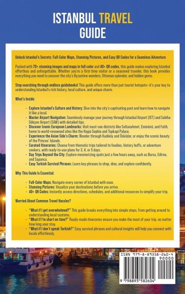Unlock Istanbul's Secrets: Maps, Stunning Pictures, and Easy QR Codes for a Seamless Adventure Packed with 70+ stunning images and maps and 40+ QR codes, this guide makes exploring Istanbul effortless and unforgettable. Whether you're a first-time visitor or a seasoned traveler, this book provides everything you need to uncover the city's Byzantine wonders, Ottoman splendor, and hidden gems. Stop searching through endless guidebooks! This guide offers more than just tourist hotspots-it's your key to understanding Istanbul's rich history, local culture, and unique charm. What's Inside: Explore Istanbul's Culture and History: Dive into the city's captivating past and learn how to navigate it like a local. Master Airport Navigation: Seamlessly manage your journey through Istanbul Airport (IST) and Sabiha Gökçen Airport (SAW) with detailed tips. Discover Iconic European Landmarks: Visit must-see districts like Sultanahmet, Eminönü, and Fatih, home to world-renowned sites like the Hagia Sophia and Topkapi Palace. Experience the Asian Side's Charm: Wander through Kad¿köy and Üsküdar, or enjoy the scenic beauty of the Princes' Islands. Curated Itineraries: Choose from thematic trips tailored to foodies, history buffs, or adventure seekers, with ready-to-use plans for 3, 4, or 5 days. Day Trips Beyond the City: Explore mesmerizing spots just a few hours away, such as Bursa, Edirne, and Sapanca. Easy Turkish Survival Phrases: Learn key phrases to shop, dine, and explore confidently. Why This Guide Is Essential: Maps: Navigate every corner of Istanbul with ease. Stunning Pictures: Visualize your destinations before you arrive. 40+ QR Codes: Instantly access directions, schedules, and additional resources to simplify your trip. Worried About Common Travel Hassles? "What if I get overwhelmed?" This guide breaks everything into simple steps, from getting around to understanding local customs. "What if I'm short on time?" Ready-made itineraries ensure you make the most of your trip, no matter how long your stay. "What if I don't speak Turkish?" Easy survival phrases and cultural insights will help you connect with locals effortlessly.