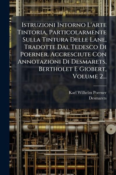 Istruzioni Intorno L'arte Tintoria, Particolarmente Sulla Tintura Delle Lane, Tradotte Dal Tedesco Di Poerner. Accresciute Con Annotazioni Di Desmarets, Bertholet E Giobert, Volume 2... offers a detailed exploration of the art of dyeing, with a specific focus on wool dyeing techniques. Translated from the German of Poerner, this volume is enriched with annotations from Desmarets, Bertholet, and Giobert, providing a comprehensive understanding of the processes and chemistry involved. This historical text delves into the intricacies of textile dyeing, making it a valuable resource for those interested in the history of technology, textile production, and the chemical arts. It provides insights into the methods and knowledge of dyeing practices of the time. This work has been selected by scholars as being culturally important, and is part of the knowledge base of civilization as we know it. This work was reproduced from the original artifact, and remains as true to the original work as possible. Therefore, you will see the original copyright references, library stamps (as most of these works have been housed in our most important libraries around the world), and other notations in the work. This work is in the public domain in the United States of America, and possibly other nations. Within the United States, you may freely copy and distribute this work, as no entity (individual or corporate) has a copyright on the body of the work. As a reproduction of a historical artifact, this work may contain missing or blurred pages, poor pictures, errant marks, etc. Scholars believe, and we concur, that this work is important enough to be preserved, reproduced, and made generally available to the public. We appreciate your support of the preservation process, and thank you for being an important part of keeping this knowledge alive and relevant.