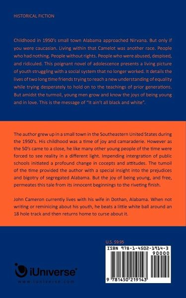 Childhood in 1950's small town Alabama approached nirvana. But only if you were caucasian. Living within that Camelot was another race. People who had nothing. People without rights. People who were abused, despised, and ridiculed. This engaging novel of adolescence presents a living picture of youth struggling with a social system that no longer worked. It details the lives of two long time friends trying reach a new understanding of equality while trying desperately to hold on to the teachings of prior generations. But amidst the turmoil, young men grow and know the joys of being young and in love. This is the message of "It ain't all black and white".