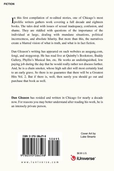 In this first compilation of re-edited stories, one of Chicago's most prolific writers gathers work covering a full decade and eighteen books. The tales deal with issues of sexual inadequacy, confusion, and shame. They are riddled with questions of the importance of the individual at large, dealing with mundane situations, political incorrectness, and absolute hilarity. But more than this, the narratives create a blurred vision of what is truth, and what is in fact fiction. Dan Gleason's writing has appeared on such websites as ausgang.com, fengi, and stopgostop. He has read live at Quimby's Bookstore, Buddy Gallery, Phyllis's Musical Inn, etc. He works an undistinguished, low paying job during the day that he would really rather not discuss further. And, he is a chain smoker, whose high salt diet will most certainly lead to an early grave. So there is no guarantee that there will be a Greatest Hits Vol. 2. But if there is, well, then surely you should go out and purchase that book as well.