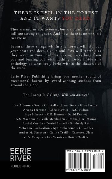 There is evil in the woods and it wants you dead. They warned us not to enter, but we didn't listen. The call too strong to ignore. And now there is no one left to save us. Beware, these things within the forest will rip out your heart and devour your soul. You will tremble as they revel in your madness, taking everything from you and leaving you with nothing. Delve inside this anthology of what truly lurks within the shadows of the trees. Eerie River Publishing brings you another round of exceptional horror by award-winning authors from around the globe. This collection features 25 terrifying tales ripped from your nightmares. You will never want to go camping again.