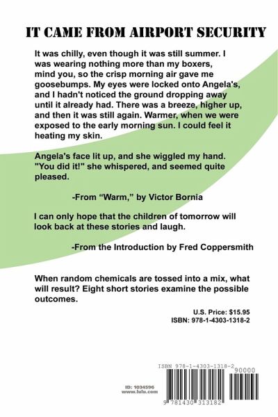 When random chemicals are tossed into a mix, what will result? Eight short stories examine the possible outcomes in It Came From Airport Security. This book and all the stories contained are licensed under the Creative Commons Attribution-ShareAlike 2.5 License. To view a copy of this license, visit http://creativecommons.org/licenses/by-sa/2.5/ or send a letter to Creative Commons, 543 Howard Street, 5th Floor, San Francisco, California, 94105, USA.