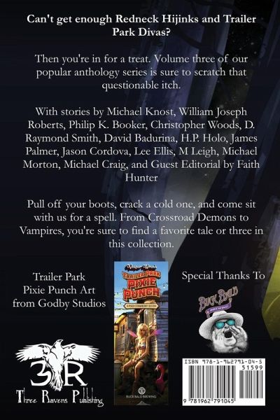 Can't get enough Redneck Hijinks and Trailer Park Divas? Then you're in for a treat. Volume three of our popular anthology series is sure to scratch that questionable itch. With stories by Michael Knost, William Joseph Roberts, Philip K. Booker, Christopher Woods, D. Raymond Smith, David Badurina, H.P. Holo, James Palmer, Jason Cordova, Lee Ellis, M Leigh, Michael Morton, Michael Craig, and Guest Editorial by Faith Hunter Pull off your boots, crack a cold one, and come sit with us for a spell. From Crossroad Demons to Vampires, you're sure to find a favorite tale or three in this collection.