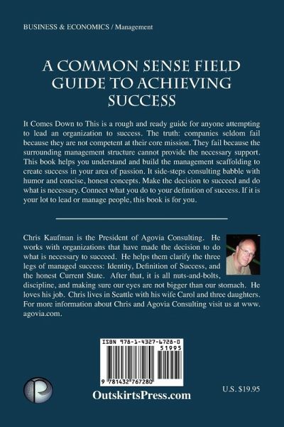 A Common Sense Field Guide to Leadership, Management, and Getting from Here to There In this book we leave behind the esoteric discussions of management theory and focus on the reality of successful organizational management. This book is about managing to success. Note the use of the words /to success rather than /for success. The change of this single tiny preposition is the basis of much of what you will read. In these pages you will find, in order to succeed in a deliberate and intentional way, you not only must do the right thing (often called "managing for success"), you must also tie those actions to your Definition of Success. You must create line-of-sight from your activities to your desired outcomes. The Three Elements There are three elements required to achieve success in a deliberate fashion rather than by luck or happenstance: leadership, management, and the nuts and bolts of operations and change. Understanding and mastering these elements gives you the ability to control your present and achieve your desired future. The Book The book is divided into three major sections: Leadership, Management, and Getting from Here to There. The first section focuses on the characteristics, capabilities, and behaviors of successful leaders. The second section discusses the mechanics and imperatives of managing an organization. The third section is about the methods of visioning, planning, and executing the change and growth necessary for healthy, long-lived organizations. Although the topics are roughly divided into the three major areas, as in real life there is no bright line between these facets of a successful organization. This field guide helps you understand them and use them holistically. /It Comes Down to This is your guide to successfully leading an organization.