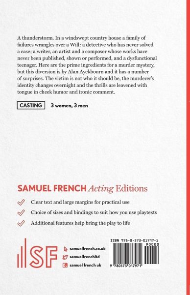 > Comedy Alan Ayckbourn Characters: 3 male, 3 female Interior A thunderstorm. In a windswept country house a family of failures wrangles over a will: a detective who has never solved a case; a writer, an artist and a composer whose works have never been published, shown or performed, and a dysfunctional teenager. Here are the prime ingredients for a murder mystery, but this diversion is by Alan Ayckbourne and it has a number of surprises. The victim is not who it should be, the murder's identity changes overnight and the thrills are leavened with tongue in cheek humor and ironic comment.