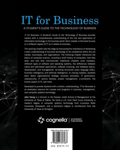 IT for Business: A Student's Guide to the Technology of Business provides readers with a comprehensive understanding of the role and application of information technology in the business world. Each chapter in the book focuses on a different aspect of IT as it relates to business. The opening chapter sets the stage by discussing the importance of developing a keen understanding of business technology to be competitive within the job market, businesses, and organizations. The following chapter introduces the basics of computer science, including a brief history of computers, how they work, and how they communicate. Additional chapters cover hardware, different types of software and operating systems, the differences between native and web-based applications, software licensing, and database basics, development, and management, including structured query language (SQL), business intelligence, and artificial intelligence. In closing chapters, students learn about organizational strategy, business processes, IT governance, cybersecurity, IT service delivery, project management, e-commerce, the human aspect of IT, and more. Developed to provide students with a holistic understanding, IT for Business is an exemplary resource for courses and programs in business, management, and computer systems technology.