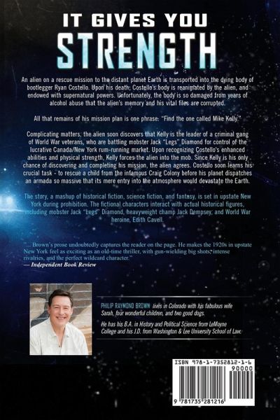 An alien on a rescue mission to the distant planet Earth is transported into the dying body of bootlegger Ryan Costello. Upon his death, Costello's body is reanimated by the alien, and endowed with supernatural powers. Unfortunately, the body is so damaged from years of alcohol abuse that the alien's memory and his vital files are corrupted. All that remains of his mission plan is one phrase: "Find the one called Mike Kelly." Complicating matters, the alien soon discovers that Kelly is the leader of a criminal gang of World War veterans, who are battling mobster Jack "Legs" Diamond for control of the lucrative Canada/New York rum-running market. Upon recognizing Costello's enhanced abilities and physical strength, Kelly forces the alien into the mob. Since Kelly is his only chance of discovering and completing his mission, the alien agrees. Costello soon learns his crucial task - to free an alien child from the infamous Craig Colony before his home world dispatches an armada so massive that its mere entry into the atmosphere would devastate the Earth. The story, a mashup of historical fiction, science fiction, and fantasy, is set in upstate New York during prohibition. The fictional characters interact with actual historical figures, including mobster Jack "Legs" Diamond, heavyweight champ Jack Dempsey, and World War heroine Edith Cavell. "... Brown's prose undoubtedly captures the reader on the page. He makes the 1920s in upstate New York feel as exciting as an old-time thriller, with gun-wielding big shots, intense rivalries, and the perfect wildcard character." -Independent Book Review