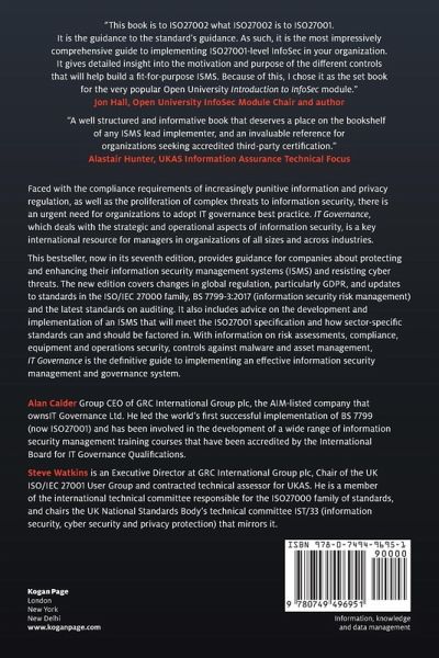 Alan Calder is Group CEO of GRC International Group plc, the AIM-listed company that owns IT Governance Ltd.. He led the world's first successful implementation of BS 7799 (now ISO 27001) and was involved in developing a wide range of information security management training courses, accredited by the International Board for IT Governance Qualifications (IBITGQ). Steve Watkins is Executive Director at GRC International Group plc, chair of the UK ISO/IEC 27001 User Group and contracted technical assessor for UKAS. He is a member of the international technical committee responsible for the ISO 27000 family of standards, and chairs the UK National Standards Body's technical committee IST/33 (information security, cyber security and privacy protection) that mirrors it.
