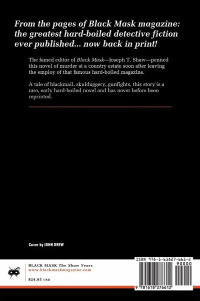 The famed editor of Black Mask-Joseph T. Shaw-penned this novel of murder at a country estate soon after leaving the employ of that famous hard-boiled magazine. A tale of blackmail, skulduggery, gunfights, this story is a rare, early hard-boiled novel and has never before been reprinted.