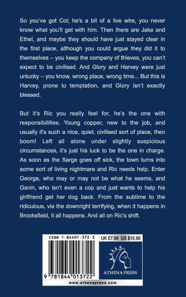 So you've got Col; he's a bit of a live wire, you never know what you'll get with him. Then there are Jake and Ethel, and maybe they should have just stayed clear in the first place, although you could argue they did it to themselves - you keep the company of thieves, you can't expect to be civilised. And Glory and Harvey were just unlucky - you know, wrong place, wrong time... But this is Harvey, prone to temptation, and Glory isn't exactly blessed. But it's Ric you really feel for, he's the one with responsibilities. Young copper, new to the job, and usually it's such a nice, quiet, civilised sort of place, then boom! Left all alone under slightly suspicious circumstances, it's just his luck to be the one in charge. As soon as the Sarge goes off sick, the town turns into some sort of living nightmare and Ric needs help. Enter George, who may or may not be what he seems, and Gavin, who isn't even a cop and just wants to help his girlfriend get her dog back. From the sublime to the ridiculous, via the downright terrifying, when it happens in Brooksfield, it all happens. And all on Ric's shift.