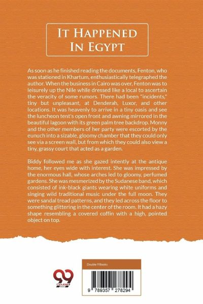 As soon as he finished reading the documents, Fenton, who was stationed in Khartum, enthusiastically telegraphed the author. When the business in Cairo was over, Fenton was to leisurely up the Nile while dressed like a local to ascertain the veracity of some rumors. There had been ""incidents,"" tiny but unpleasant, at Denderah, Luxor, and other locations. It was heavenly to arrive in a tiny oasis and see the luncheon tent's open front and awning mirrored in the beautiful lagoon with its green palm tree backdrop. Monny and the other members of her party were escorted by the eunuch into a sizable, gloomy chamber that they could only see via a screen wall, but from which they could also view a tiny, grassy court that acted as a garden. Biddy followed me as she gazed intently at the antique home, her eyes wide with interest. She was impressed by the enormous hall, whose arches led to gloomy, perfumed gardens. She was mesmerized by the Sudanese band, which consisted of ink-black giants wearing white uniforms and singing wild traditional music under the full moon. They were sandal tread patterns, and they led across the floor to something glittering in the center of the room. It had a hazy shape resembling a covered coffin with a high, pointed object on top.