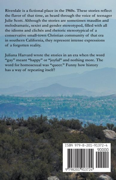 Riverdale is a fictional place in the 1960s. These stories reflect the flavor of that time, as heard through the voice of teenager Julie Scott. Although the stories are sometimes maudlin and melodramatic, sexist and gender stereotyped, filled with all the idioms and clichés and rhetoric stereotypical of a conservative small-town Christian community of that era in southern California, they represent intense expressions of a forgotten reality.