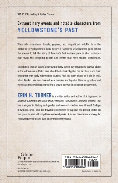 True Tales from Yellowstone’s Past—from the volcanic eruption that formed its landscape to the great fires of 1988 Waterfalls, mountains, trees, geysers, and magnificent wildlife form the backdrop for the first national park’s lively history. It Happened in Yellowstone goes behind the scenes to tell its story, in short episodes that reveal the intriguing people and events that have shaped Geyserland. • Experience Truman Everts’s harrowing thirty-seven day struggle to survive alone in the landscape in 1870. • Learn about the historic flight of the Nez Perce and their encounter with early Yellowstone tourists. • Feel the earth shake as it did in 1959 when Quake Lake was formed in a massive earthquake. • Glimpse grizzlies and wolves as these wild creatures find a way to survive in a changing ecosystem.