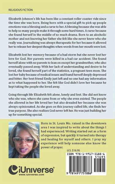 Elizabeth Johnson's life has been like a constant roller coaster ride since the time she was born. Being born with a special gift to pick up people emotions was a blessing and a curse to her. A blessing because she was able to help so many people make it through some hard times. A curse because she found herself in the middle of so much drama. Born to an alcoholic mother and not knowing her father she felt like she never knew who she really was. Journalizing was always therapeutic for her because it allowed her to release her deepest thoughts when words from her mouth were lost. Elizabeth lost her memory because of a bad storm but she never lost her love for God. Her parents were killed in a bad car accident. She found herself alone with no parents to lean on except her grandmother, who also eventually passed away. With her lack of understanding and desire to be loved, she found herself part of the statistics, a pregnant teen mom. She lost her baby because of medical issues and found herself deeply depressed and bitter. Her best friend Emily just left and no one had any information as to what happened to her. She felt like God didn't love her because he kept taking the people she loved away. Going through life Elizabeth felt alone, lonely and lost. She did not know who she was, where she came from or why she even existed. The people she allowed in her life loved her but also dreaded her because she was always opinionated. As she goes on this journey called life, she finds her true purpose. She also realizes God never left her. He was just building her up for something special.