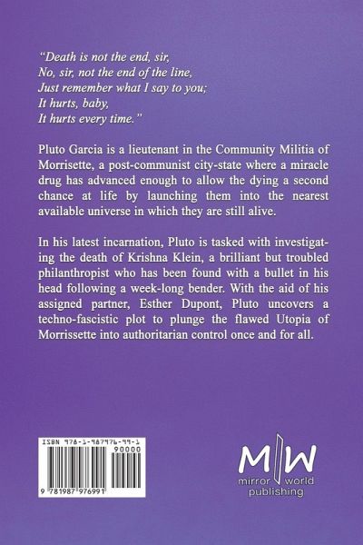 "Death is not the end, sir, No, sir, not the end of the line, Just remember what I say to you; It hurts, baby, It hurts every time." Pluto Garcia is a lieutenant in the Community Militia of Morrisette, a post-communist city-state where a miracle drug has advanced enough to allow the dying a second chance at life by launching them into the nearest available universe in which they are still alive. In his latest incarnation, Pluto is tasked with investigating the death of Krishna Klein, a brilliant but troubled philanthropist who has been found with a bullet in his head following a week-long bender. With the aid of his assigned partner, Esther Dupont, Pluto uncovers a techno-fascistic plot to plunge the flawed Utopia of Morrissette into authoritarian control once and for all.