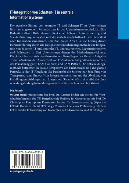 Der parallele Einsatz von zentraler IT und Schatten-IT in Unternehmen führt zu ungewollten Redundanzen in der Unternehmensarchitektur. Eine Reduktion dieser Redundanzen dient einer höheren Automatisierung und Standardisierung, kann aber auch die Vorteile von Schatten-IT wie Flexibilität oder Innovation eliminieren. Das Ziel dieser Arbeit ist die Lösung dieser Herausforderung durch das Design einer Entscheidungsmethode zur Integration von Schatten-IT und zentraler IT. Literaturreviews, Experteninterviews und Fallstudien in fünf Unternehmen dienen der Methodenentwicklung. Die Arbeit bedient sich den theoretischen Grundlagen des Mensch-Aufgabe-Technik-Systems, der Ähnlichkeit von IT-Systemen, Integrationstaxonomien, der Pfadabhängigkeit, EAM Concerns und EAM Pattern. Die Entscheidungsmethode betrachtet die lokale Perspektive des Fachbereichs und die globale Perspektive der IT-Abteilung. Sie beschreibt die Schritte zur Schaffung von Transparenz, dem Entwurf von Integrationsszenarien und der Ableitung von Handlungsempfehlungen zur Integration. Sie unterstützt eine effektive Entscheidungsfindung beim Management von Unternehmensarchitekturen.