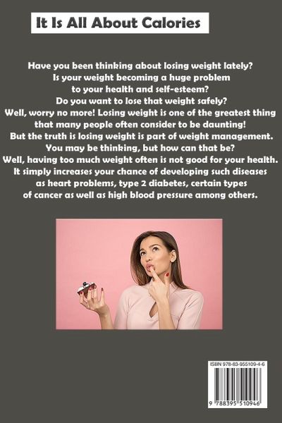 ¿¿¿ Do you want to eat what you want and still lose weight? ¿¿¿ ¿¿¿ Does that sound like it’s too good to be true? ¿¿¿ ¿¿¿ This book will show you how it’s possible! ¿¿¿ Millions of people are overweight. There is currently an epidemic of obesity, particularly in the western world, and there seems to be no end in sight. Nowadays millions of people diet, in the hope that they can shed the excess weight and look better. But, as we know only too well, it isn’t that easy. So what if you took a different approach to losing weight? Inside the pages of this book, It Is All About Calories: How to Eat What You Want and Lose Weight Immediately, you will find that losing weight needn’t be an impossible chore, with advice contained in chapters on: How to reset what you eat and when you eat it To fast or not to fast The benefits of weight loss How much you should be exercising Why you should lose weight Exercises for you to consider Diet plans And lots more… With the information contained within this book you could be well on the way to losing weight, looking great and being far healthier than you have been in years. ¿¿¿ ¿¿¿Get a copy today and start losing weight right now! Simply scroll up and click BUY NOW button.¿¿¿ ¿¿¿