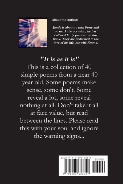 PLEASE NOTE - ALL PROFIT FROM THIS BOOK WILL BE DONATED TO CANCER RESEARCH. Jamie is about to turn Forty and to mark the occasion, he has collated a collection of 40 simple poems into this book. Each poem is accompanied by a musical soundtrack and the reader is encouraged to seek out the songs and connect the dots themselves. Some poems make sense, some don't. Some reveal a lot, some reveal nothing at all. Don't take it all at face value, but read between the lines. Please read this with your soul and ignore the warning signs.