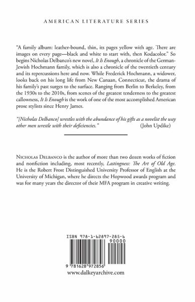 "A family album: leather-bound, thin, its pages yellow with age. There are images on every page-black and white to start with, then Kodacolor." So begins Nicholas Delbanco's new novel, It Is Enough, a chronicle of the German-Jewish Hochmann family, which is also a chronicle of the twentieth century and its repercussions here and now. While Frederick Hochmann, a widower, looks back on his long life from New Canaan, Connecticut, the drama of his family's past surges to the surface. Ranging from Berlin to Berkeley, from the 1930s to the 2010s, from scenes of the greatest tenderness to the greatest callowness, It Is Enough is the work of one of the most accomplished American prose stylists since Henry James.