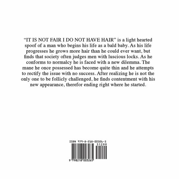 "IT IS NOT FAIR I DO NOT HAVE HAIR" is a light hearted spoof of a man who begins his life as a bald baby. As his life progresses he grows more hair than he could ever want, but finds that society often judges men with luscious locks. As he conforms to normalcy he is faced with a new dilemma. The mane he once possessed has become quite thin and he attempts to rectify the issue with no success . After realizing he is not the only one to be follicly challenged, he finds contentment with his new appearance, therefor ending right where he started.
