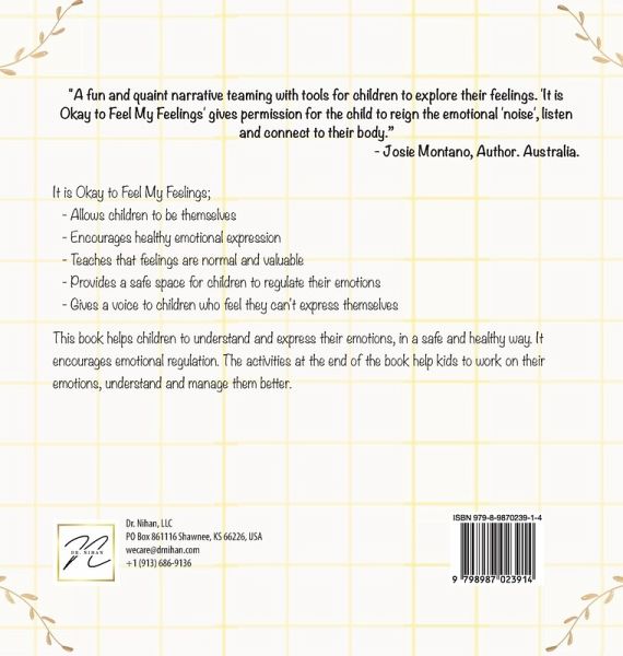 Help your child understand their feelings and express their emotions with rhymes, activities, and colorful pictures - A personalized book for your child. It is Okay to Feel My Feelings; - Allows children to be themselves - Encourages healthy emotional expression - Teaches that feelings are normal and valuable - Provides a safe space for children to regulate their emotions - Gives a voice to children who feel they can't express themselves This book helps children to understand and express their emotions, in a safe and healthy way. It encourages emotional regulation. The activities at the end of the book help kids to work on their emotions, understand and manage them better. ¿¿"A fun and quaint narrative teaming with tools for children to explore their feelings. 'It is Okay to Feel My Feelings' gives permission for the child to reign the emotional 'noise', listen and connect to their body. - Josie Montano, Author. Australia.