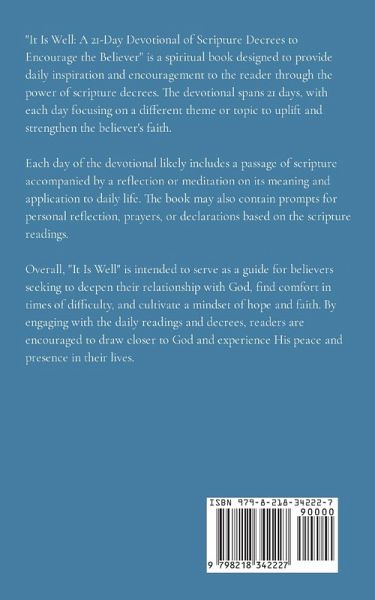 "It is Well" is a spiritual growth and encouragement journey that will uplift your soul and strengthen your faith. Amid life's challenges, there is a profound need for believers like you to hold on to the promises of God, to find solace in His Word, and to declare His truth over your life. This 21-day devotional has been lovingly crafted to provide inspiration and empowerment as you navigate the twists and turns of your journey.