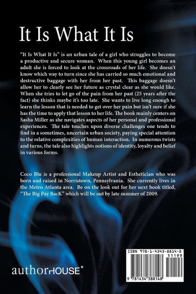 "It Is What It Is" is an urban tale of a girl who struggles to become a productive and secure woman. When this young girl becomes an adult she is forced to look at the crossroads of her life. She doesn't know which way to turn since she has carried so much emotional and destructive baggage with her from her past. This baggage doesn't allow her to clearly see her future as crystal clear as she would like. When she tries to let go of the pain from her past (25 years after the fact) she thinks maybe it's too late. She wants to live long enough to learn the lesson that is needed to get over her pain but isn't sure if she has the time to apply that lesson to her life. The book mainly centers on Sasha Miller as she navigates aspects of her personal and professional experiences. The tale touches upon diverse challenges one tends to find in a sometimes, uncertain urban society, paying special attention to the relative complexities of human interaction. In numerous twists and turns, the tale also highlights notions of identity, loyalty and belief in various forms.