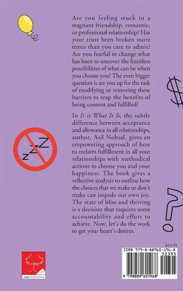 Are you feeling stuck in a stagnant friendship, romantic, or professional relationship? Has your trust been broken more times than you care to admit? Are you fearful to change what has been to uncover the limitless possibilities of what can be when you choose you? The even bigger question is are you up for the task of modifying or removing these barriers to reap the benefits of being content and fulfilled? In It is What It Is, the subtle difference between acceptance and allowance in all relationships, author, Asil Nohsal, gives an empowering approach of how to reclaim fulfillment in all your relationships with methodical actions to choose you and your happiness. The book gives a reflective analysis to outline how the choices that we make or don't make can impede our own joy. The state of bliss and thriving is a decision that requires some accountability and effort to achieve. Now, let's do the work to get your heart's desires.