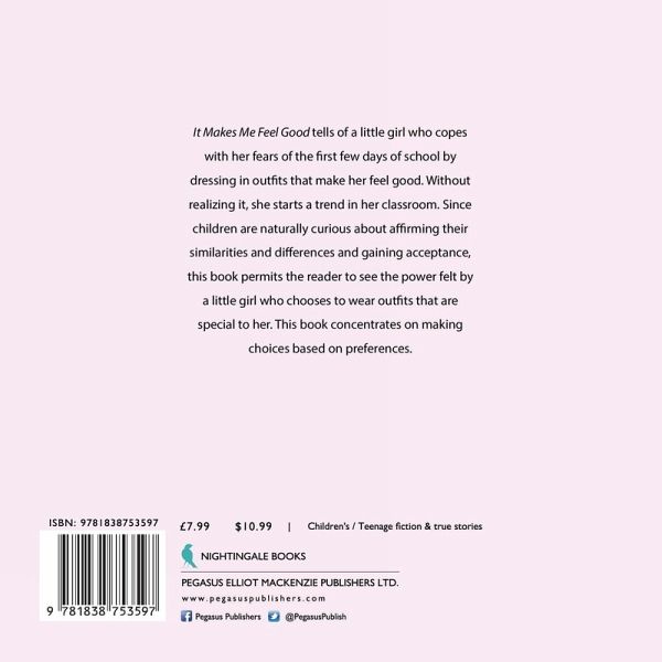 It Makes Me Feel Good tells of a little girl who copes with her fears of the first few days of school by dressing in outfits that make her feel good. Without realizing it, she starts a trend in her classroom. Since children are naturally curious about affirming their similarities and differences and gaining acceptance, this book permits the reader to see the power felt by a little girl who chooses to wear outfits that are special to her. This book concentrates on making choices based on preferences.