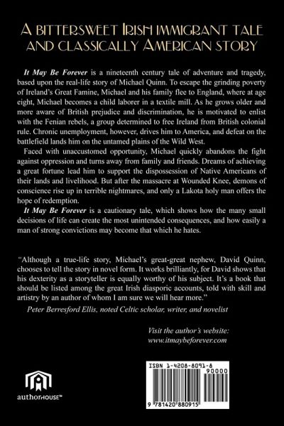 It May Be Forever is a nineteenth century tale of adventure and tragedy, based upon the real-life story of Michael Quinn. To escape the grinding poverty of Ireland's Great Famine, Michael and his family flee to England, where at age eight, Michael becomes a child laborer in a textile mill. As he grows older and more aware of British prejudice and discrimination, he is motivated to enlist with the Fenian rebels, a group determined to free Ireland from British colonial rule. Chronic unemployment, however, drives him to America, and defeat on the battlefield lands him on the untamed plains of the Wild West. Faced with unaccustomed opportunity, Michael quickly abandons the fight against oppression and turns away from family and friends. Dreams of achieving a great fortune lead him to support the dispossession of Native Americans of their lands and livelihood. But after the massacre at Wounded Knee, demons of conscience rise up in terrible nightmares, and only a Lakota holy man offers the hope of redemption. It May Be Forever is a cautionary tale, which shows how the many small decisions of life can create the most unintended consequences, and how easily a man of strong convictions may become that which he hates.