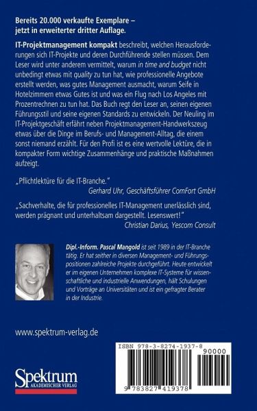 IT-Projektmanagement kompakt ist eine Lektüre, die sich lohnt, schon allein weil Aufwand und Zeit im unglaublich günstigen Verhältnis zum Erkenntniswert steht. Mangold nimmt kein Blatt vor den Mund und insgeheim hat man/frau (Projektleiter/in) sich vielleicht auch schon so manches gedacht. So zusammengefasst und auf den Punkt gebracht gab es das jedoch bestimmt noch nicht zu lesen. Als Anregung, Leitfaden oder Bestätigung für IT-Projektleiter unbedingt empfehlenswert. www.amazon.de