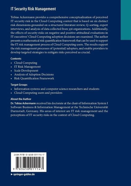 This book provides a comprehensive conceptualization of perceived IT security risk in the Cloud Computing context that is based on six distinct risk dimensions grounded on a structured literature review, Q-sorting, expert interviews, and analysis of data collected from 356 organizations. Additionally, the effects of security risks on negative and positive attitudinal evaluations in IT executives' Cloud Computing adoption decisions are examined. The book's second part presents a mathematical risk quantification framework that can be used to support the IT risk management process of Cloud Computing users. The results support the risk management processes of (potential) adopters, and enable providers to develop targeted strategies to mitigate risks perceived as crucial.