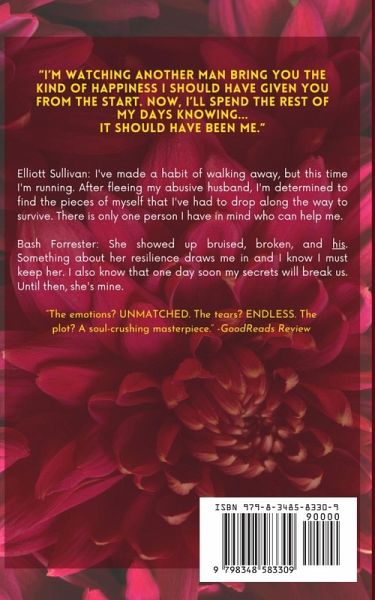Elliott Sullivan: I've made a habit of walking away, but this time I'm running. After fleeing my abusive husband, I'm determined to find the pieces of myself that I've had to drop along the way to survive. There is only one person I have in mind who can help me. Bash Forrester: She showed up bruised, broken, and his. Something about her resilience draws me in and I know I must keep her. I also know that one day soon my secrets will break us. Until then, she's mine.