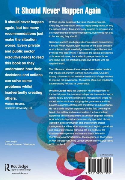 In It Should Never Happen Again, Dr Mike Lauder questions the value of public inquiries. Every day, we hear about another inquiry being set up, or why the last one failed to deliver the hoped for outcomes. A great deal of time and taxpayers' money is spent on inquiries and even more on implementing their recommendations, but the author suggests that those conducting inquiries might be considered (by their own test) criminally negligent in the way they do so and that it is no surprise that they do not lead to the learning they should. The focus of Mike Lauder's research is the gaps between what is known, what knowledge is used by practitioners and those who judge them. He contends that the difference between the judicial perspective and that of practitioners who are judged by the inquiry process creates barriers that impede others from learning. Crucially, inquiry outcomes do not assist the leadership of organisations to improve risk governance. It Should Never Happen Again is based on research into high profile public inquiries and presidential commissions in the UK, the USA, Continental Europe, and elsewhere. Embracing issues ranging from terrorist attacks to pollution, fire and air disasters; criminal cases; banking and bribery scandals; and the state of public services, Mike Lauder contrasts the judicial perspective of those who inquire, the academic perspective of those who know and the practical perspective of those who are required to act, and offers new models for understanding risk and its governance.