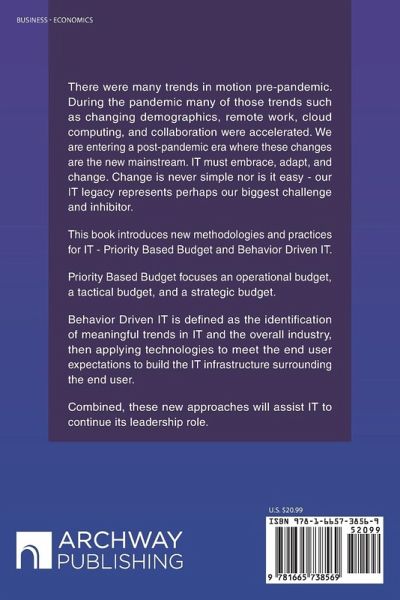 There were many trends in motion pre-pandemic. During the pandemic many of those trends such as changing demographics, remote work, cloud computing, and collaboration were accelerated. We are entering a post-pandemic era where these changes are the new mainstream. IT must embrace, adapt, and change. Change is never simple nor is it easy - our IT legacy represents perhaps our biggest challenge and inhibitor. This book introduces new methodologies and practices for IT - Priority Based Budget and Behavior Driven IT. Priority Based Budget focuses an operational budget, a tactical budget, and a strategic budget. Behavior Driven IT is defined as the identification of meaningful trends in IT and the overall industry, then applying technologies to meet the end user expectations to build the IT infrastructure surrounding the end user. Combined, these new approaches will assist IT to continue its leadership role.