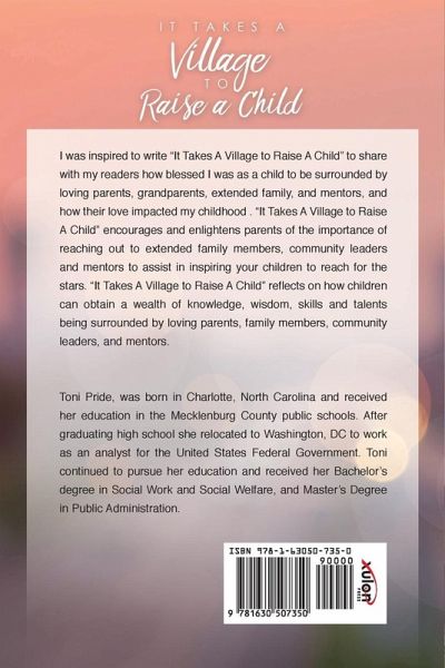 I was inspired to write "It Takes A Village to Raise A Child" to share with my readers how blessed I was as a child to be surrounded by loving parents, grandparents, extended family, and mentors, and how their love impacted my childhood . "It Takes A Village to Raise A Child" encourages and enlightens parents of the importance of reaching out to extended family members, community leaders and mentors to assist in inspiring your children to reach for the stars. "It Takes A Village to Raise A Child" reflects on how children can obtain a wealth of knowledge, wisdom, skills and talents being surrounded by loving parents, family members, community leaders, and mentors. Toni Pride, was born in Charlotte, North Carolina and received her education in the Mecklenburg County public schools. After graduating high school she relocated to Washington, DC to work as an analyst for the United States Federal Government. Toni continued to pursue her education and received her Bachelor's degree in Social Work and Social Welfare, and Master's Degree in Public Administration.