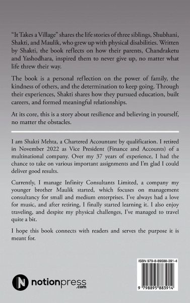"It Takes a Village" shares the life stories of three siblings, Shubhani, Shakti, and Maulik, who grew up with physical disabilities. Written by Shakti, the book reflects on how their parents, Chandraketu and Yashodhara, inspired them to never give up, no matter what life threw their way. The book is a personal reflection on the power of family, the kindness of others, and the determination to keep going. Through their experiences, Shakti shares how they pursued education, built careers, and formed meaningful relationships. At its core, this is a story about resilience and believing in yourself, no matter the obstacles.
