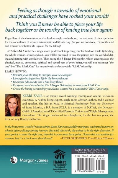 It Takes All 5: A Single Moms Guide to Finding The REAL One is a clever treatise that speaks in a girlfriend-to-girlfriend tone. It is designed to comprehensively help heal the inside and outside "whole" woman. There is important, all-encompassing work to be done in becoming healthy for oneself before making the leap into the next romantic liaison. Solid statistics, tangible facts, proven healing mechanisms and first person stories of wisdom provide a beacon to show readers how to become a more confident and loving whole woman. Then using the 5 finger philosophy, readers will be able to identify not just "the one" but the REAL One for an authentic and renewable REALationship.