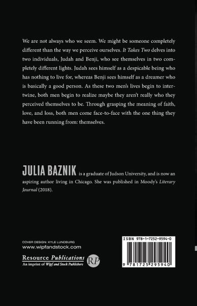 We are not always who we seem. We might be someone completely different than the way we perceive ourselves. It Takes Two delves into two individuals, Judah and Benji, who see themselves in two completely different lights. Judah sees himself as a despicable being who has nothing to live for, whereas Benji sees himself as a dreamer who is basically a good person. As these two men's lives begin to intertwine, both men begin to realize maybe they aren't really who they perceived themselves to be. Through grasping the meaning of faith, love, and loss, both men come face-to-face with the one thing they have been running from: themselves.